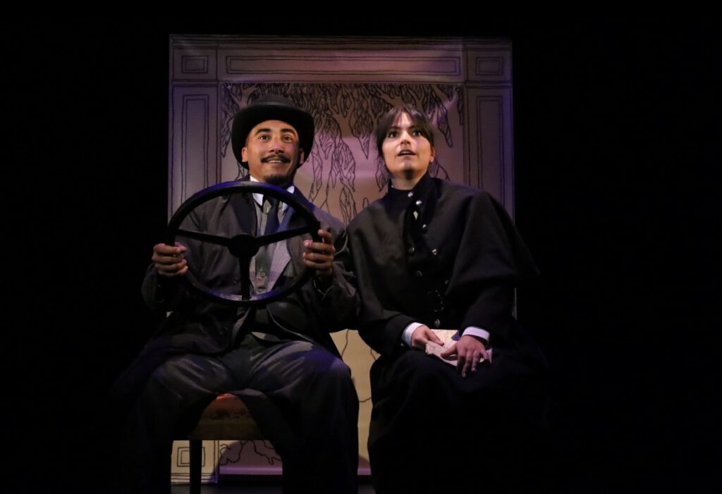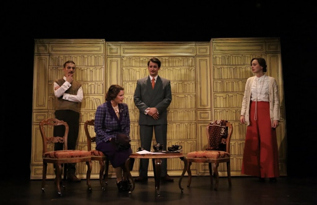 La mise en scène, pensée par David Legras et Axel Stein Kurdzielewicz, avait la volonté d’être très cinématographique. Il y a plusieurs lieux, nous ne sommes pas dans un huis-clos conventionnel. Dans notre histoire, on passe d’un commissariat, à un salon de thé, à la berge brumeuse de l’étang de Silent Pool, il fallait donc un système mouvant et évolutif. Résultat : des panneaux à roulettes recouverts de dessins interchangeables et un mobilier tout aussi mobile dans le style année 20. Grâce à ce dispositif, (mis en place par David Legras, Jacques Poix-Terrier et Thalie Amossé) les décors viennent aux comédiens, et pas l’inverse, ce qui nous permet de laisser place à l’imaginaire. Nos spectateurs sortent de la pièce émerveillés avec la sensation d’avoir voyagé.